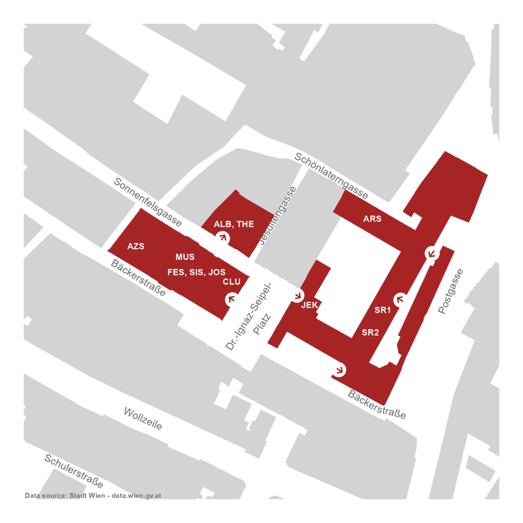 – Ground Floor: Seminarraum 1 (SR1), Seminarraum 2 (SR2), Arrupe-Saal (ARS), Jesuitenkeller (JEK)