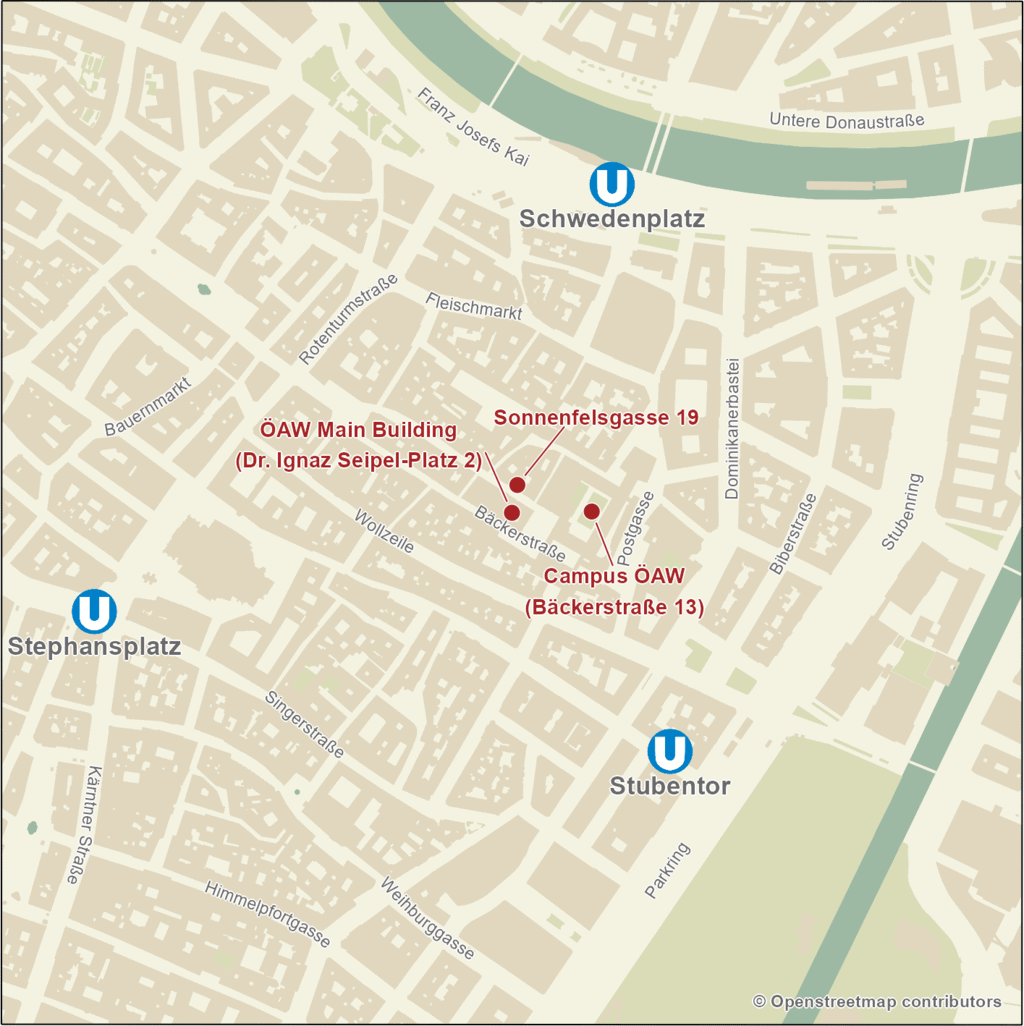 The congress will take place at the Austrian Academy of Sciences right in the historical city centre of Vienna. The conference rooms are located in three buildings close to each other. Please find a detailed map with all rooms marked below